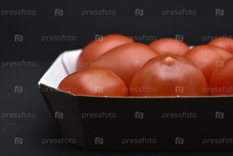 Красные помидоры в картонной коробке. Упаковка помидоров из магазина на черном фоне