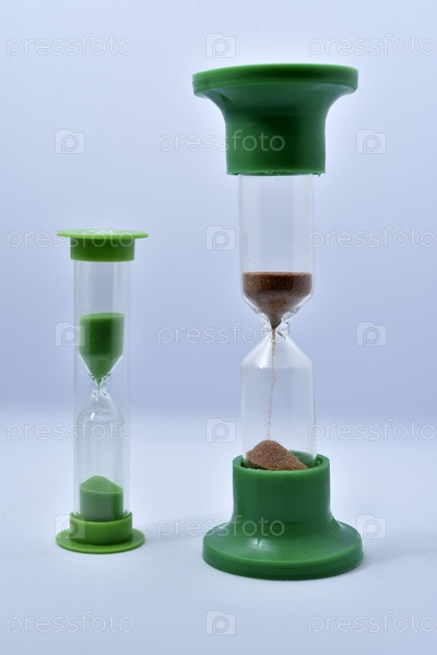 Стеклянные песочные часы на белом фоне. Песочные часы из разноцветного стекла