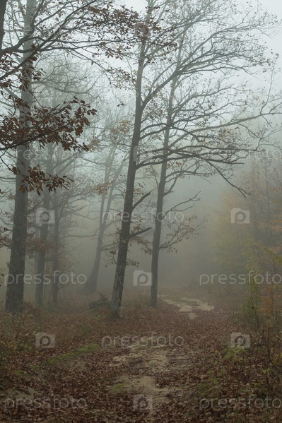 Туманное утро в осеннем лесу. Дорога, усыпанная коричневыми листьями, петляет между голыми деревьями. Красивый загадочный осенний пейзаж