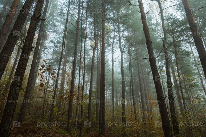 Красивый сосновый лес туманным утром. Длинные стволы сосен с зелеными кронами и желтыми листьями деревьев в туманном лесу. Осенний пейзаж