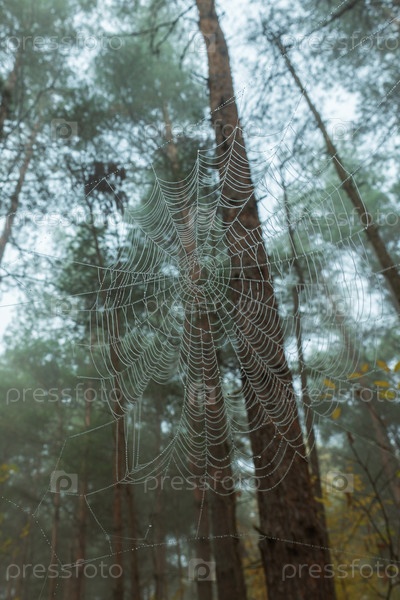 Паутина с каплями воды на фоне размытых стволов и сосновых крон. Паутина в утреннем туманном хвойном лесу