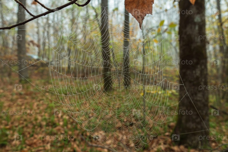 Паутина с каплями росы на фоне размытого осеннего леса. Паутина в утреннем туманном лесу