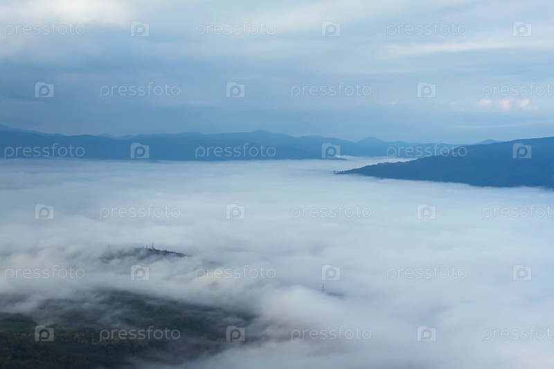 Лощина покрыта туманом. На заднем плане горные хребты и облачное небо. Красивый пейзаж с туманом