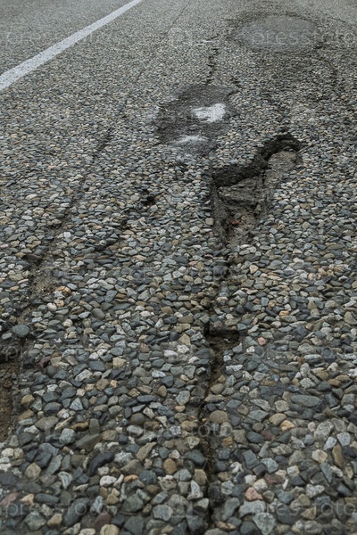 Ямы и трещины на асфальтовой дороге. Разрушенное дорожное полотно. Плохое состояние дороги, требующей ремонта. Концепция безопасных дорог