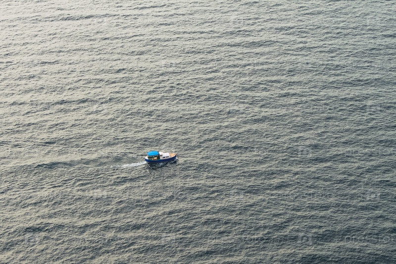 Небольшая рыбацкая лодка посреди моря. Рыбацкая лодка в спокойном Черном море. Вид сверху