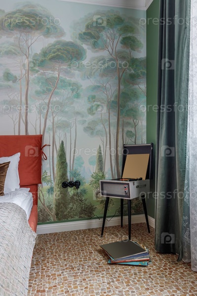 Спальня в стиле ретро с кроватью, старым шкафом и зелеными стенами