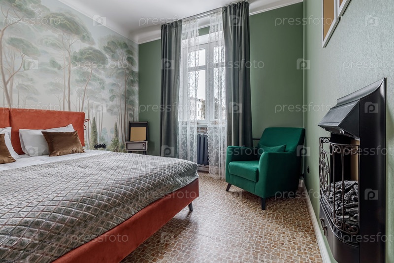 Спальня в стиле ретро с кроватью, старым шкафом и зелеными стенами
