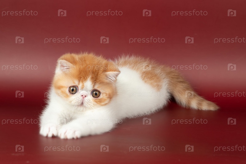 Маленький красивый рыжий котенок экзотический на бордовом фоне в студии. Окрас персидского котенка рыжий с белым