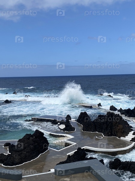 Пляж Мадейры, сделаны перила, ступеньки для спуска, океан отгорожен