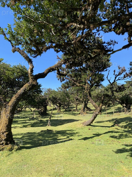 Лавровый лес Мадейры, день, яркое солнце, зеленый луг
