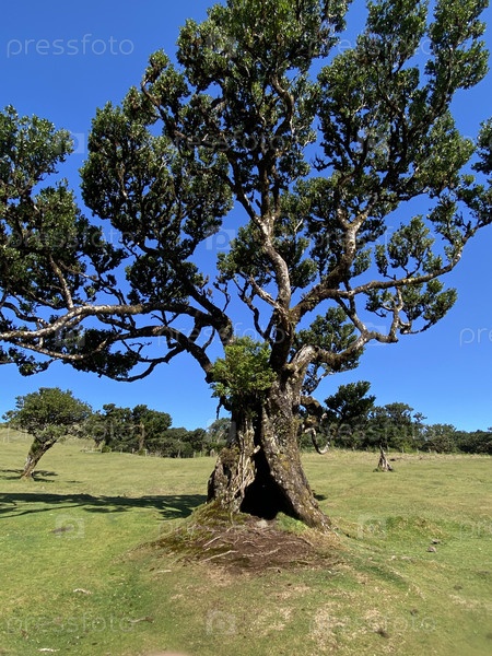 Лавровый лес Мадейры, день, яркое солнце, зеленый луг
