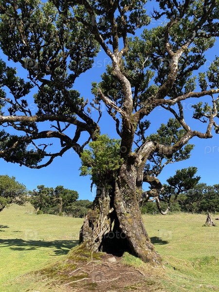 Лавровый лес Мадейры, день, яркое солнце, зеленый луг