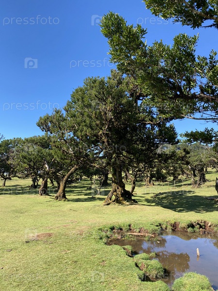 Лавровый лес Мадейры, день, яркое солнце, зеленый луг
