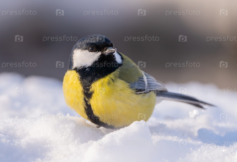 Большая синяя, Parus major, прыгает по глубокому снегу холодным зимним утром в поисках пищи