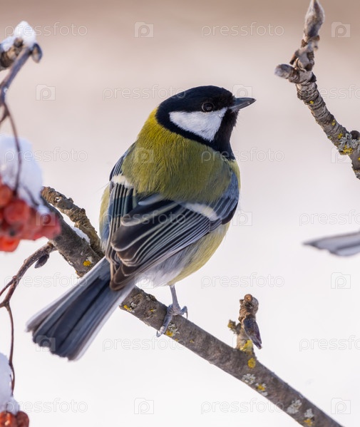 Большой синяк, Parus major, сидит на ветке красной репчицы в морозное зимнее утро