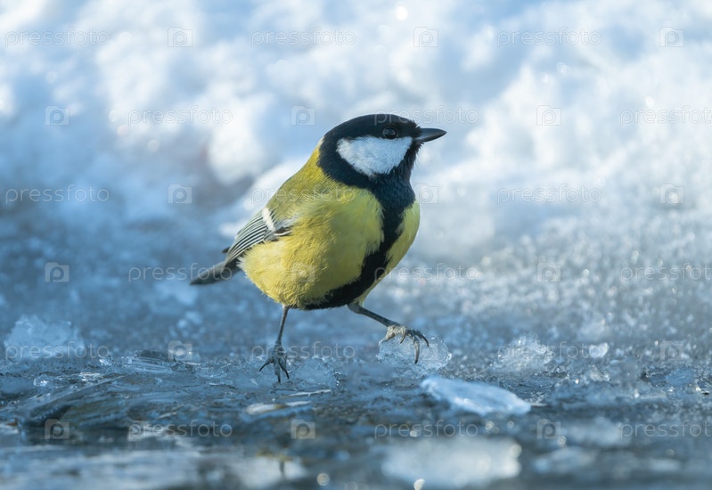 Замерзшая синица стоит на льду посреди замерзшей лужи во время сильного мороза