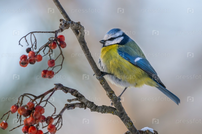 Евразийская лазоревка сидит на ветке красной рябины, покрытой снегом, солнечным морозным утром