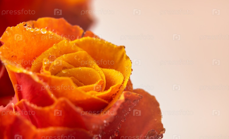 Фон для поздравительной открытки, красивая желто-красная роза в каплях росы крупным планом