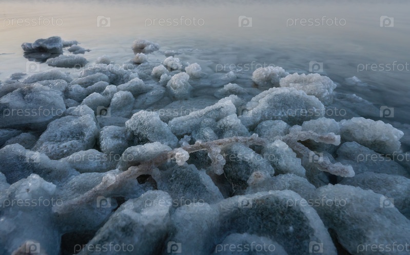 Соленое озеро Баскунчак, соленые ветки перекати-поля и застывшие в соляной рапе камни
