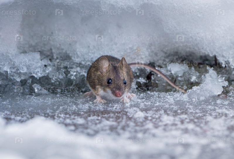 Полевая мышь морозным зимним утром выползла из норы, проделанной в глубоком снегу, в поисках пищи