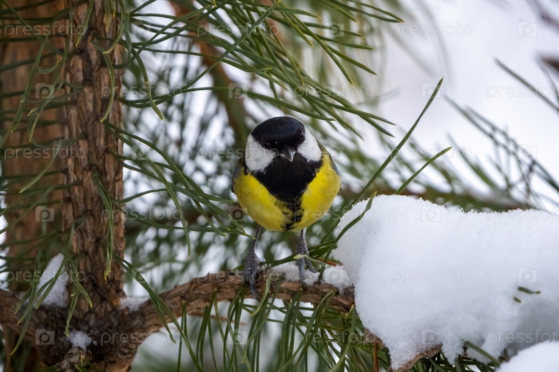 Большая синяжка, Parus major, сидит на ветке сосны в морозное зимнее утро