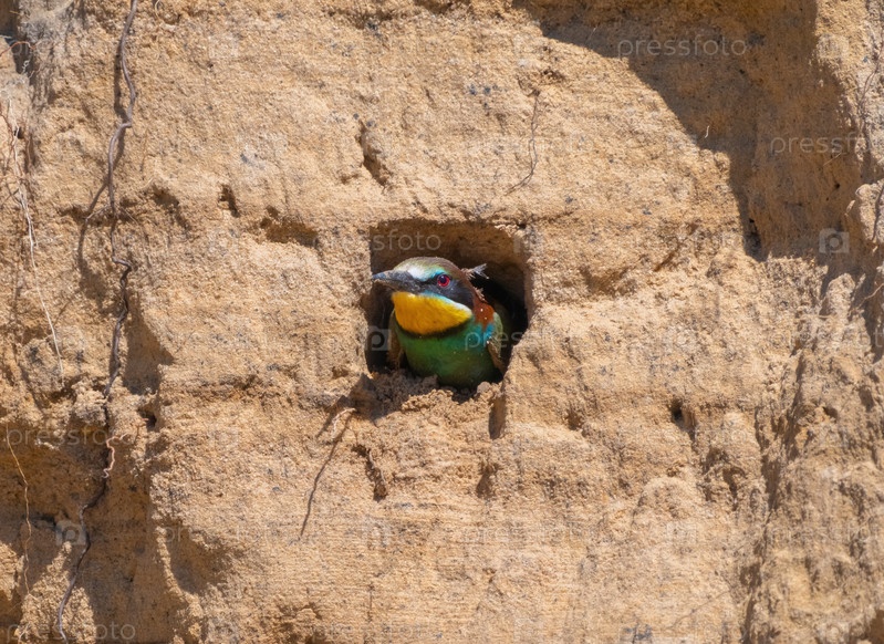 Европейская птица-пчелоед выглядывает из своей норы, сделанной в песчаной скале