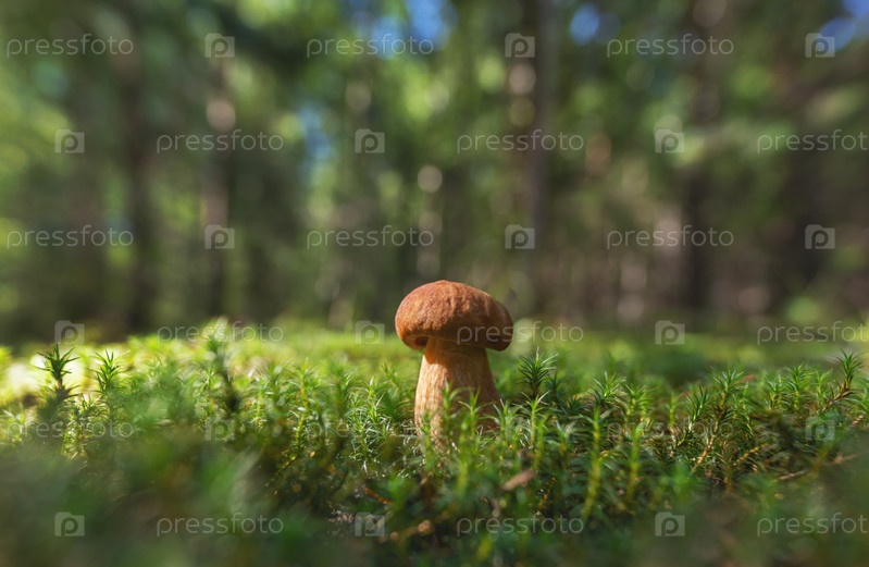 Белый гриб вырос на замшелой лесной поляне среди высоких деревьев