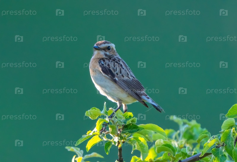 Птица-пастбище Saxicola сидит на ветке на размытом зеленом фоне