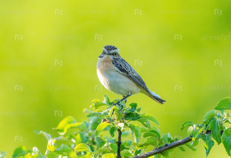 Птица-пастбище Saxicola сидит на ветке на размытом зеленом фоне