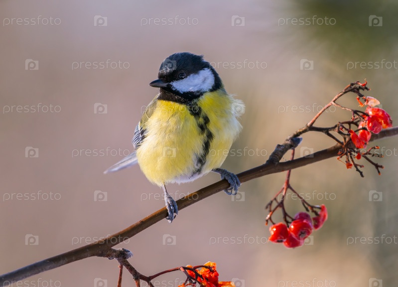 Большой синяк, Parus major, сидит на ветке красной репчицы в морозное зимнее утро