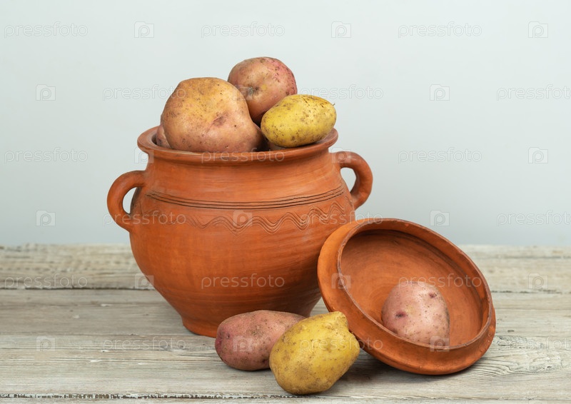Картофель в деревенской глиняной посуде на столе из белых досок