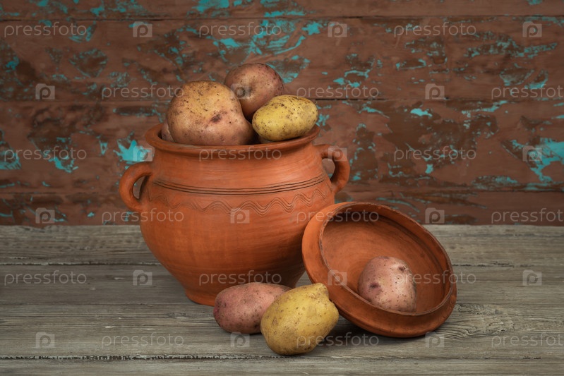 Картофель в деревенской керамике на фоне стены с облупившейся краской