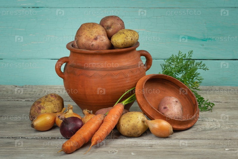 Ассортимент органических корнеплодов для приготовления простого деревенского супа в глиняной посуде