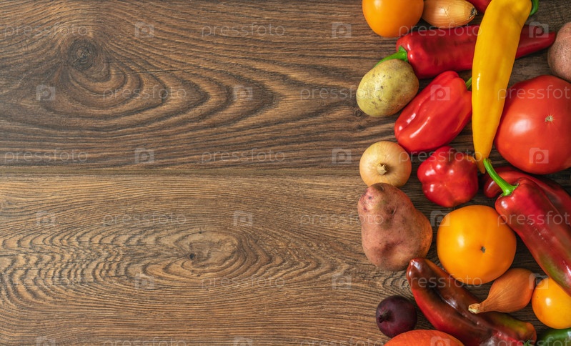 Свежие органические овощи желтых и красных цветов на дубовых досках