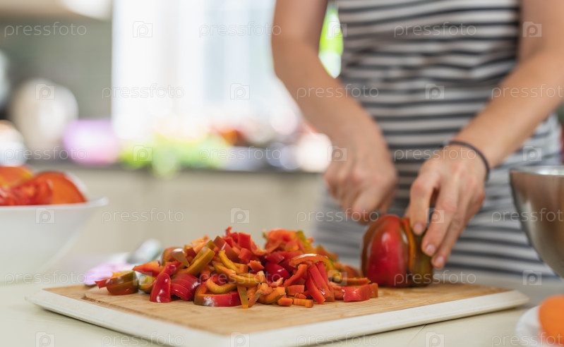 Крупным планом женщина режет сладкий перец кухонным ножом на ярко освещенной кухне