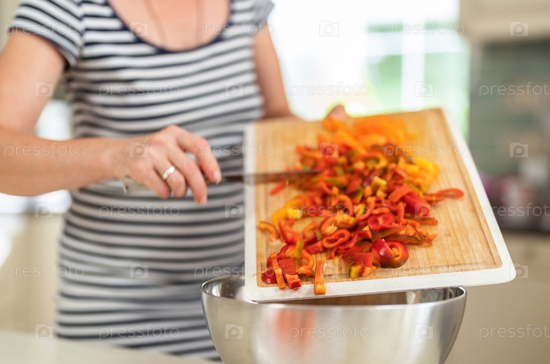 Крупным планом женщина режет сладкий перец кухонным ножом на ярко освещенной кухне
