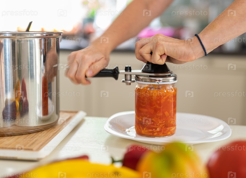 Домашнее консервирование овощей. Женщина крупным планом сохраняет овощной салат в стеклянной банке