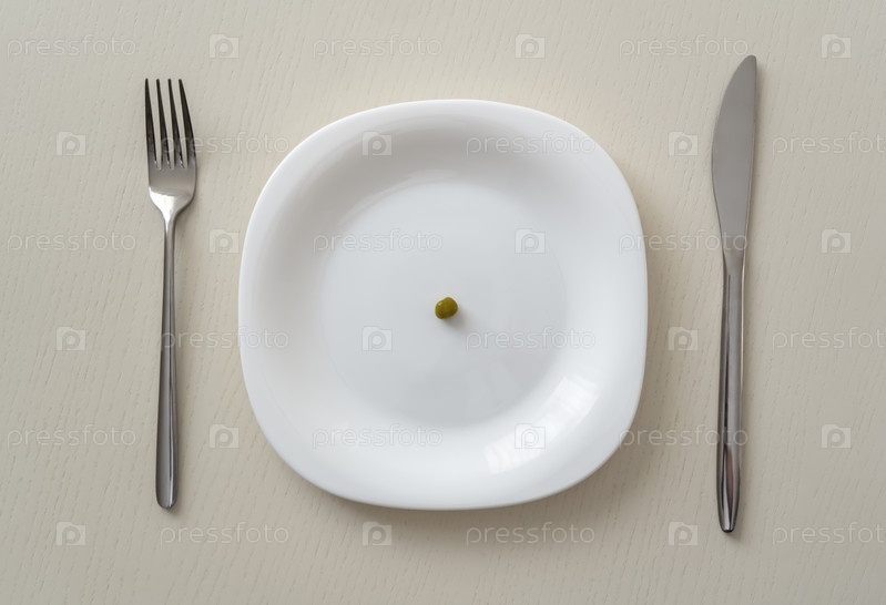 Маленькая горошинка на белой тарелке на белом столе с ножом и вилкой, минимум калорий