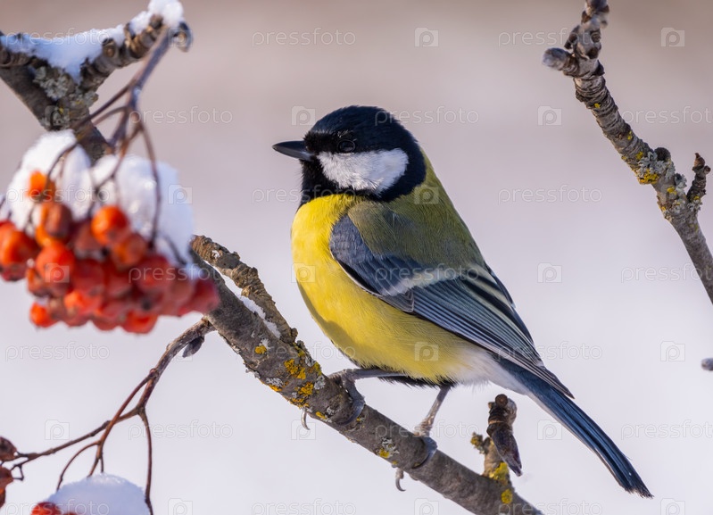 Большой синяк, Parus major, сидит на ветке красной репчицы в морозное зимнее утро