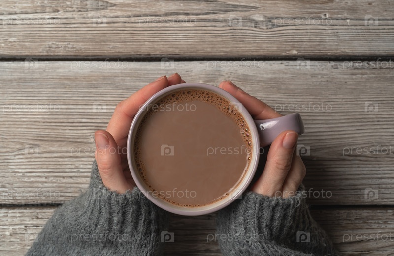 Женские руки в сером свитере держат кружку горячего шоколада на деревенском деревянном фоне с копией пространства