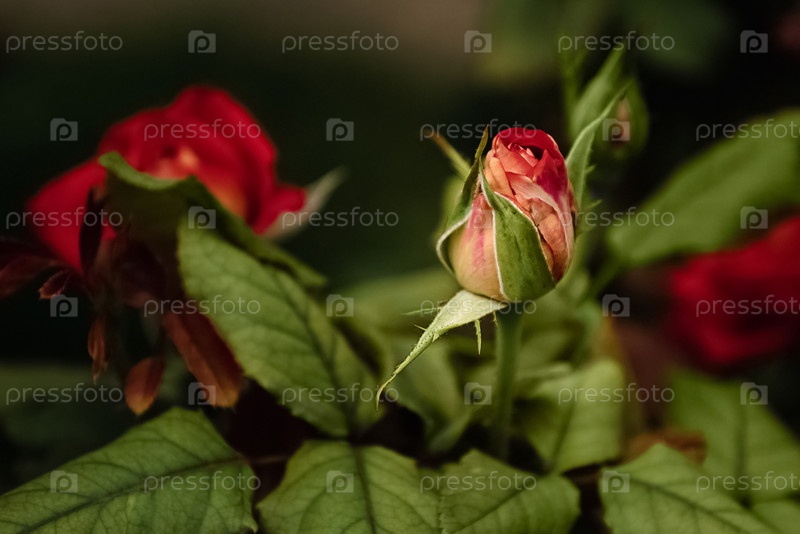 Бутон алой розы в саду крупным планом