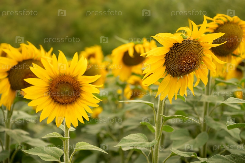Цветущие желтые головки подсолнухов в сельскохозяйственном поле крупным планом
