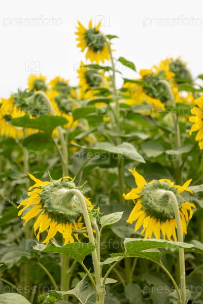 Соцветия подсолнуха на поле фермера повернулись к солнцу