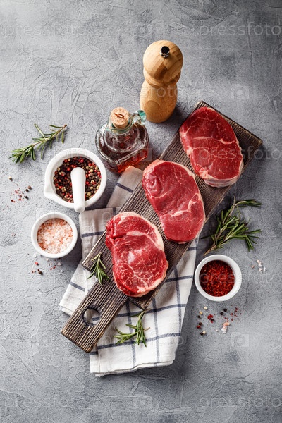 Три куска традиционного тонкого стейка, нарезанного из вырезки, с оливковым маслом, солью, розмарином и перцем. Стейки из сырого мяса Блэк Ангус Прайм подходят для приготовления на гриле и на сковороде. Вид сверху