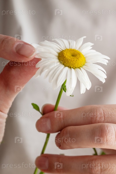 Женщина гадает на ромашке, держа в руке белый цветок и отрывая лепестки