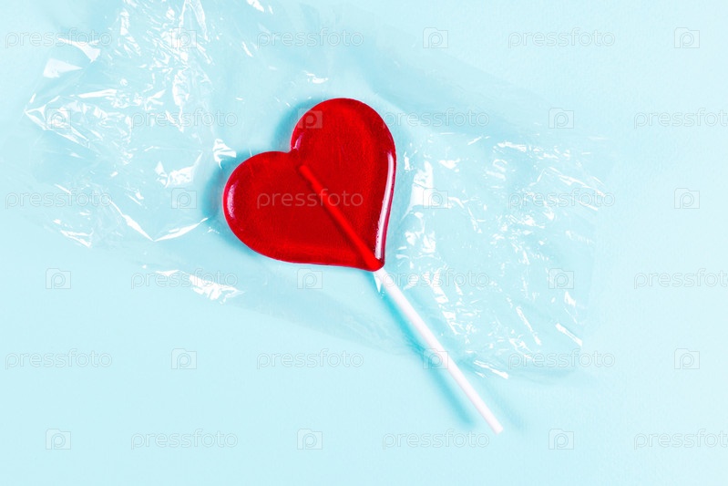 Леденец на палочке с красным сердцем на прозрачной упаковке и синем фоне, вид сверху