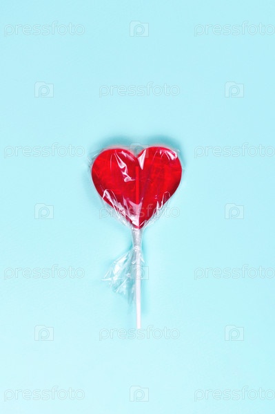 Леденец с красным сердцем в прозрачной упаковке на синем фоне, вид сверху
