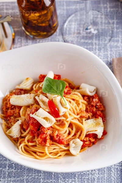 Паста с кальмарами и помидорами