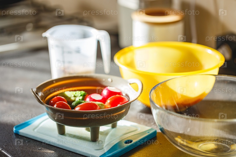 Различные цветные органические овощи, вымытые в дуршлаге на кухне