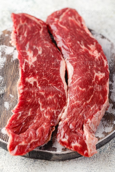 Сырой стейк со специями на деревянной разделочной доске